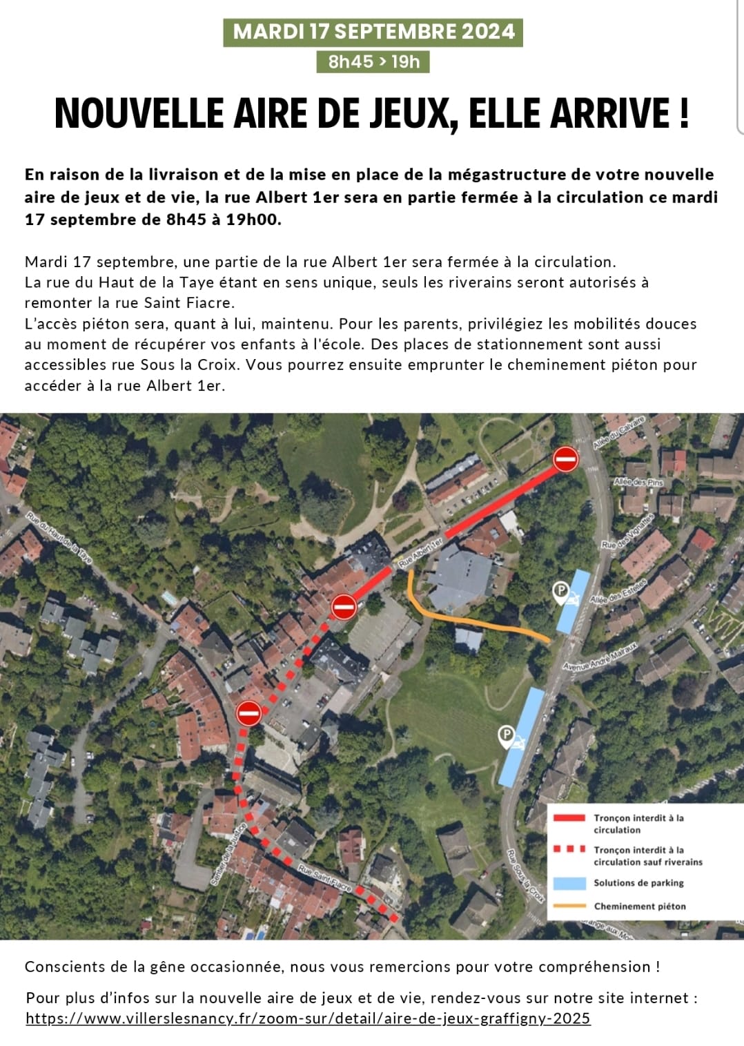 17 septembre de 8h45 à 19h, livraison de la nouvelle aire de jeux et de vie à proximité de l'école avec fermeture des voies adjacentes.